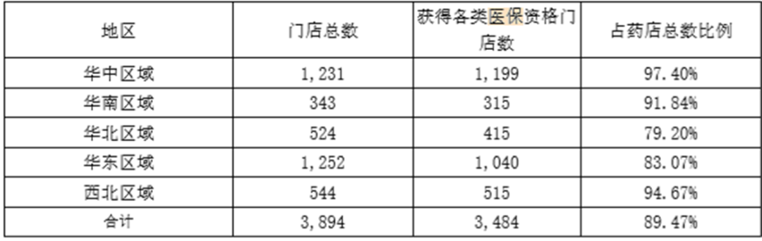 据老百姓大药房2019年年报,报告期内,公司直营门店中已取得各类“医疗保险定点零售药店”资格的药店达3484家,占公司门店总数 89.47%。