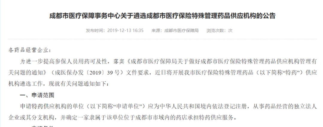 按照特药规范遴选原则(特药定点药店),各地的遴选标准也是医保定点药店,如去年成都市医疗保障事务中心发布《关于遴选成都市医疗保险特殊管理药品供应机构的公告》公告,其中明确申办特殊管理药品应具备具备直联医保信息系统的软、硬件条件,能确保数据实时上传、结算等相关业务的正常运行。配合市医疗保障经办机构搭建满足医保特药管理需求的信息系统;