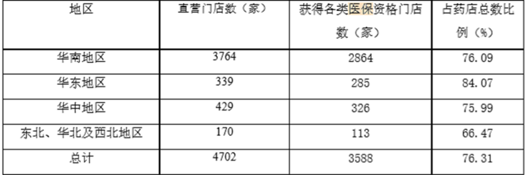 据大参林2019年年报,截至2019年12月31日,公司共有4702家直营连锁门店,已取得各类“医疗保险定点零售药店” 资格的药店达3588家,其中,2019年新增医保门店540家,医保门店总数占公司直营药店总数的76.31%。