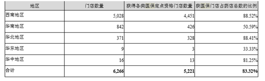 据一心堂年报,截至2019年12月31日,公司共有6266家直营连锁门店,已取得各类“医疗保险定点零售药店”资格的药店达5221家,占公司药店总数的83.32%。报告期内,公司医保刷卡销售占总销售的41.11%。