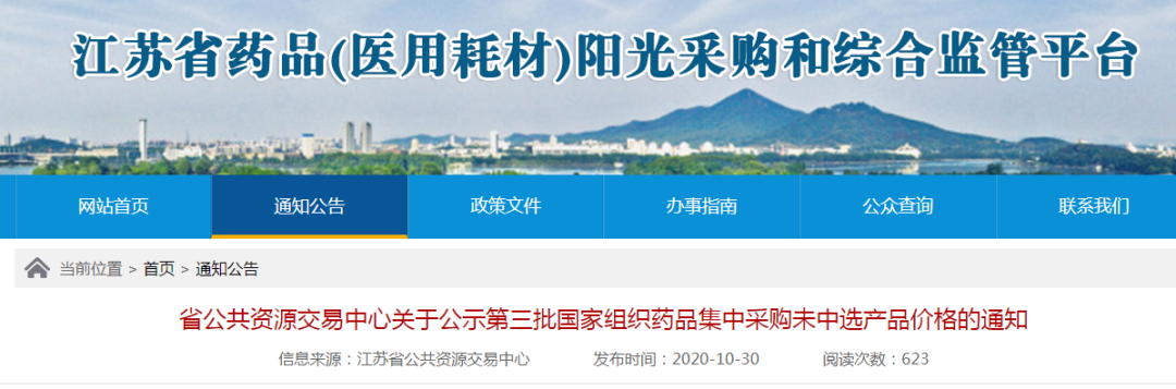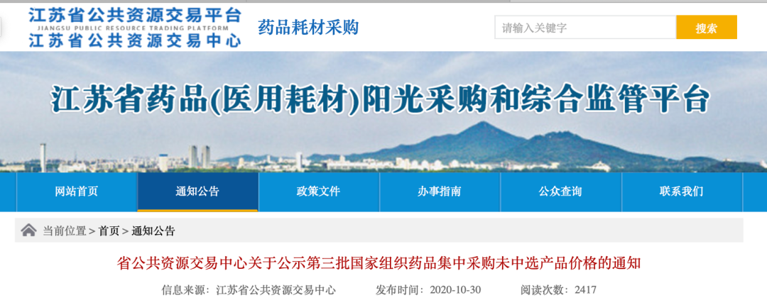 昨日(10月31日),江苏省药品阳光采购和综合监管平台公布《第三批国家组织药品集中采购未中选产品价格的通知》。