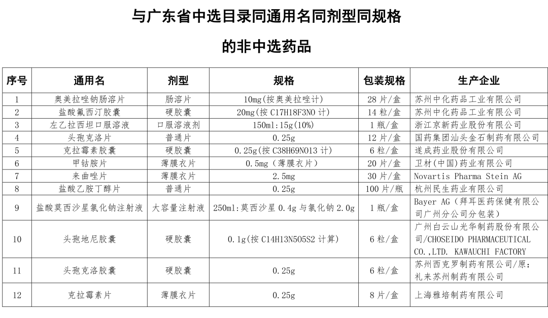 与广东省中选目录同通用名、同剂型、不同规格的药品。