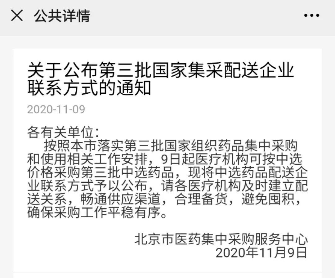 通知明确,从11月9日起北京市医疗机构可按中选价格采购第三批中选药品,并公布第三批配送企业应急联系人通讯录,要求各医疗机构及时建立配送关系,畅通供应渠道,合理备货,避免囤积,确保采购工作平稳有序。