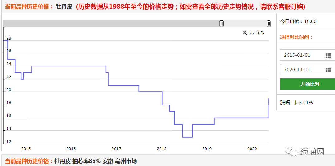 这个药材,去年年底笔者曾经报道过,是几年来跌价比较厉害的品种。从药通网的价格数据我们可以看到,牡丹皮的价格在2015年之前位于高位,从2017年就开始持续下跌,在2019年跌到近几年的低谷。