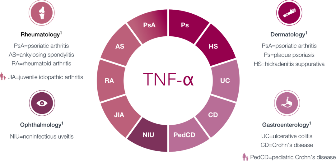 TNFα是自身免疫疾病开发最成功的靶点,在TNFα抑制剂出现之前,包括类风湿性关节炎、银屑病等患者并无太多的用药选择,生活质量差,目前TNFa抑制剂三大巨头还属艾伯维、辉瑞和强生,造就了百亿美元自身免疫疾病市场。