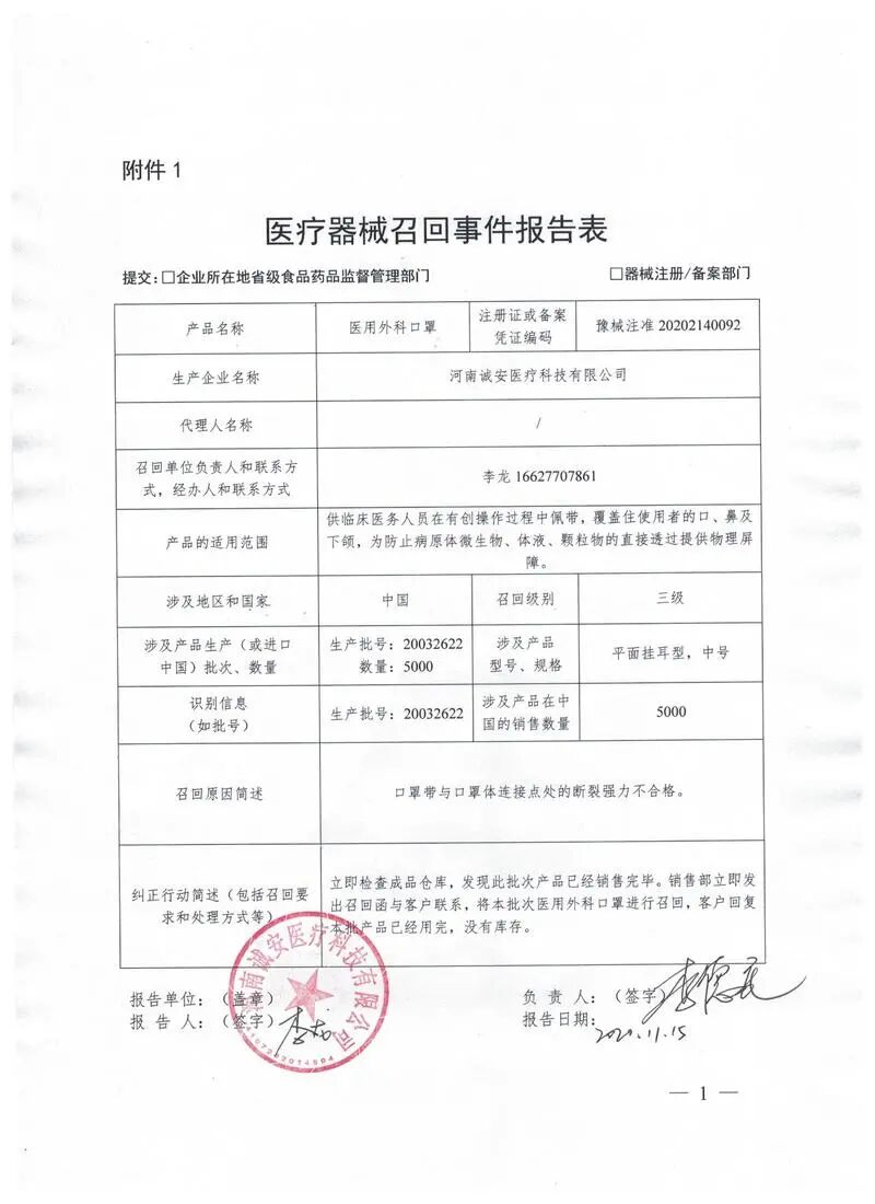河南诚安医疗科技有限公司报告,由于其生产的一批次医用外科口罩断裂强力不符合规定,企业对其主动召回,召回级别为三级。召回产品的型号、规格及批次等详细信息见《医疗器械召回事件报告表》。