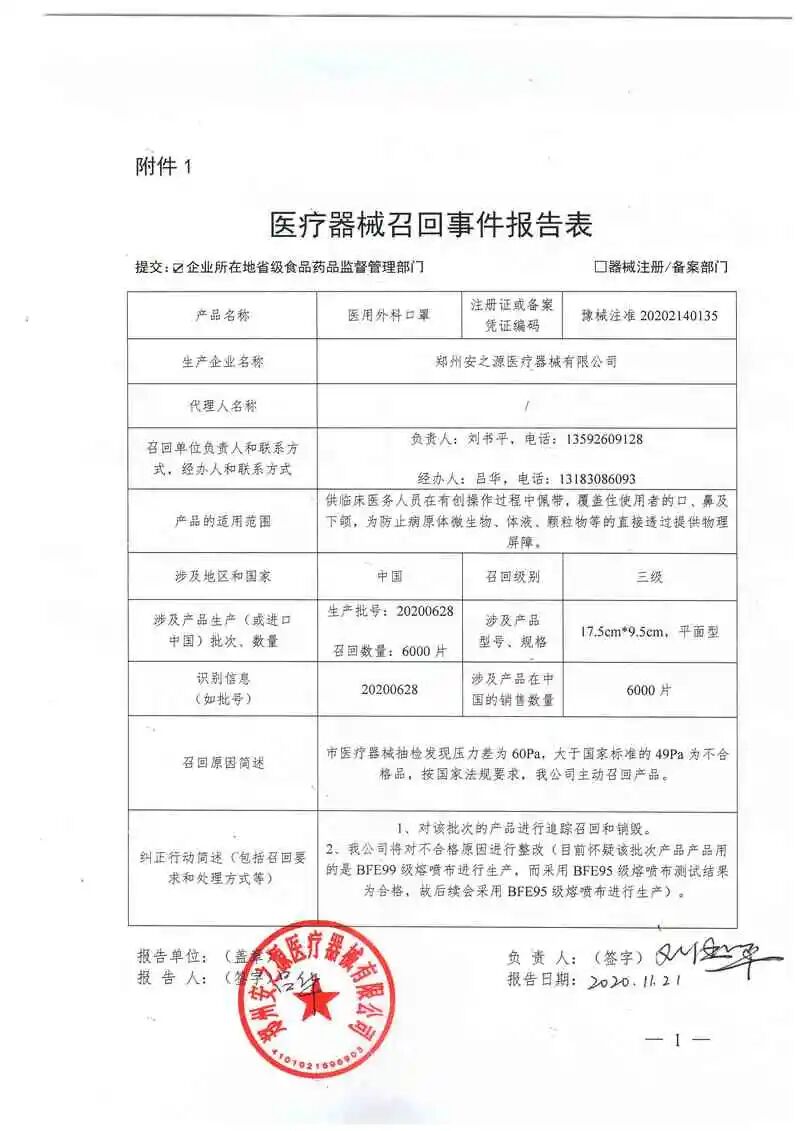 郑州安之源医疗器械有限公司报告,由于其生产的一批次医用外科口罩压力差不符合规定,企业对其主动召回,召回级别为三级。召回产品的型号、规格及批次等详细信息见《医疗器械召回事件报告表》。
