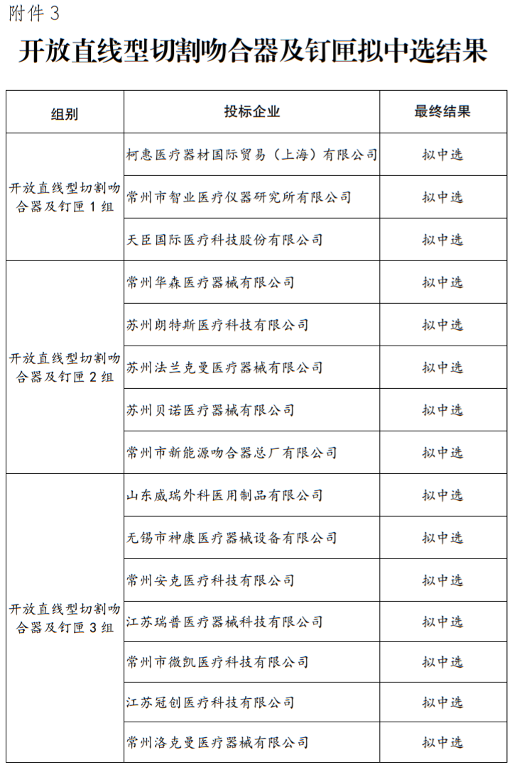 开放直线型切割吻合器及钉匣拟中选械企包括柯惠医疗、常州华森、苏州朗特斯等;