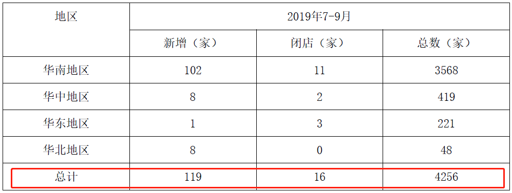 2019年7-9月新增门店119家(新开门店103家,收购门店0家),因地方性规划,资源整合及策略性调整等因素闭店16家,净增门店103家。