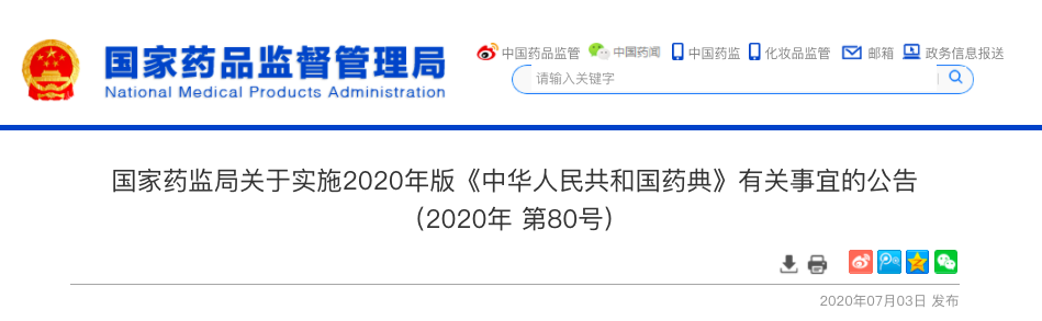 国家药监局关于实施2020年版《中华人民共和国药典》有关事宜的公告(2020年 第80号)