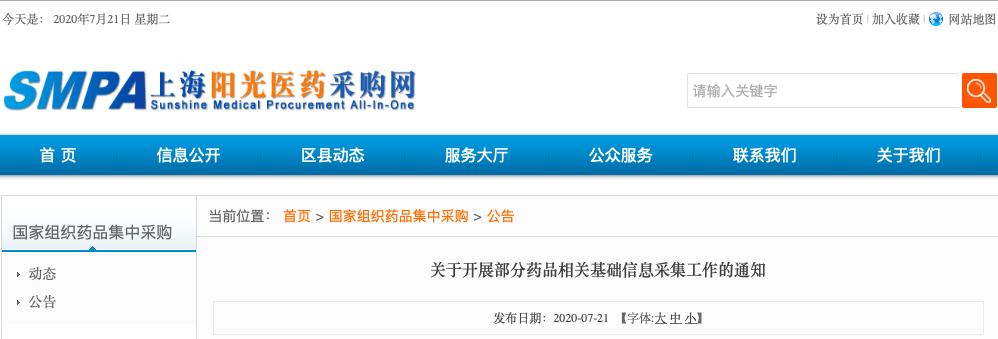 今日(7月21日),上海阳光医药采购网发布《关于开展部分药品相关基础信息采集工作的通知》(以下简称《通知》)。