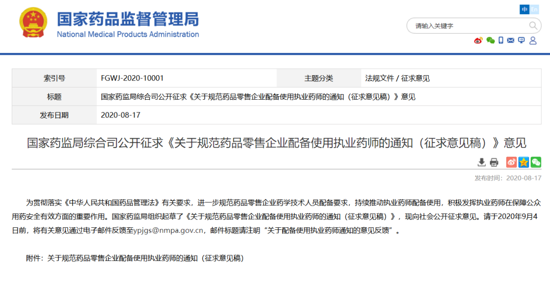 国家药监局组织起草了《关于规范药品零售企业配备使用执业药师的通知(征求意见稿)》,现向社会公开征求意见。