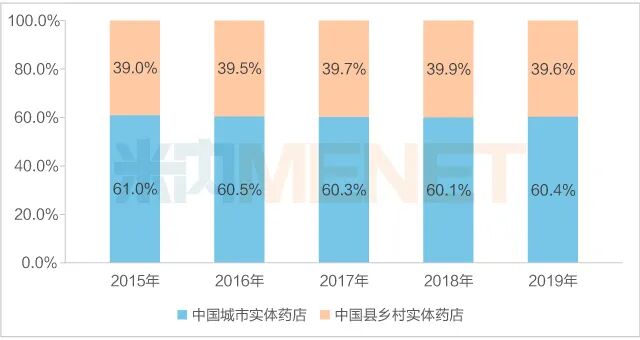 米内网推出的《中国城市实体药店化学药与中成药终端竞争格局》数据显示,2019年“中国城市实体药店”(指:地级及以上城市实体药店)药品规模占中国实体药店药品规模60.4%;“中国县乡村实体药店”(指:非地级城市,也就是县乡村实体药店)药品规模占比达39.6%。