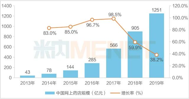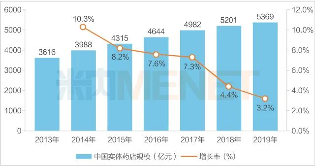 2019年中国网上药店销售规模突破千亿大关,为1251亿元,同比增长38.2%,与前几年的高速增长相比,增速有所放缓;而实体药店(含药品和非药品)2019年销售规模为5369亿元,同比增长3.2%。