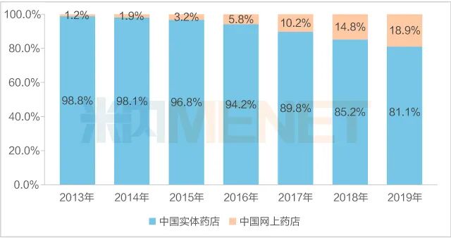 图2:2013-2019年中国实体药店和网上药店(含药品和非药品)销售额占比