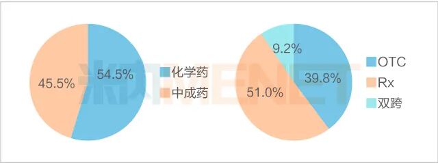 2019年中国城市实体药店(含地级及以上城市)药品销售规模中,化学药占比54.5%,较2018年上升3.2个百分点;此消彼长之下,中成药占比下滑至45.5%。从药品类型看,处方药占半壁江山,市场份额为51.0%,较2018年上升2.7个百分点,非处方药占39.8%,双跨占9.2%,可见处方外流成效显著,DTP药房等院外渠道做出的贡献也愈发明显。
