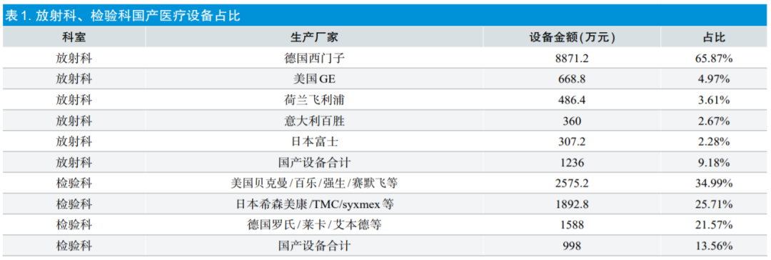 根据上述文章分析,从表1可以看出,放射科国产设备厂家主要是上海联影、上海锐珂、江阴万康等;检验科国产设备厂家主要是苏州新波、深圳迈瑞、上海北昂、江苏英诺华等。国产设备在以设备为主体的放射科、检验科只能占据小部份额。