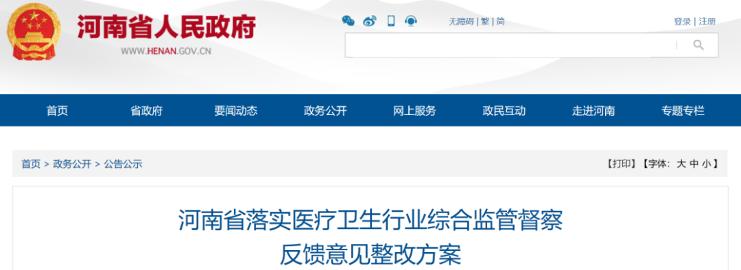 近日,河南省人民政府发布《河南省落实医疗卫生行业综合监管督查反馈意见整改方案》。