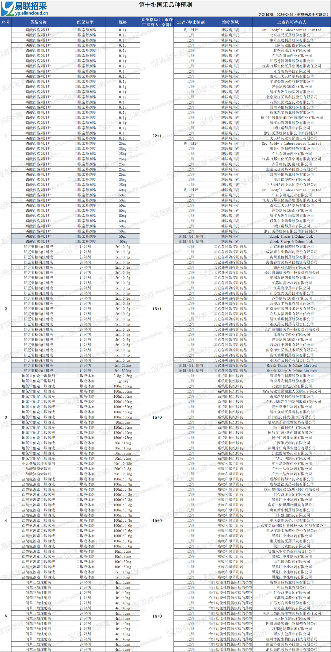 据易联统计,截止到2月26日,在未纳入国采的品种中已有120个品种满足原研企业+过评企业≥5家的竞争格局,初步具备纳入国采的条件(详见下图)。